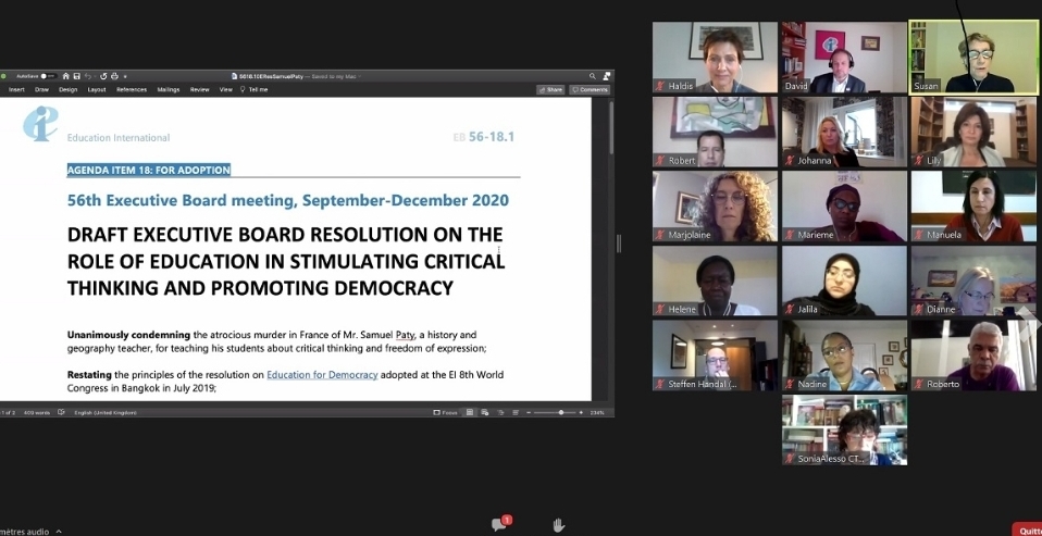 第56次EI執委會因應疫情採視訊會議方式,於10月27日正式召開,並決議通過支持教師享有教授言論自由、討論自由、批判性思考等,有助於學生成為具行動力公民的課程。此次決議與10月16日法國教師山繆帕堤,為善盡教師專業職責,教授上述課程卻慘遭激進分子殺害有關。