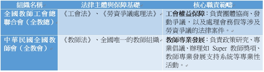 本文旨在依據歷史資料,概述全國教師會(全教會)與全國教師工會總聯合會(全教總)的發展歷程、組織職責劃分,及其在法律地位上轉變的專業性分析。