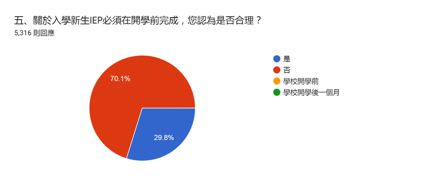對於IEP完成的時間點,原本是規定在特教法的施行細則,但教育部的修法草案提列到到母法中,在四場公聽會前公布的版本(110/09/30)中,第29條的敘寫是「身心障礙學生個別化教育計畫,學校應於新生及轉學生入學後一個月內訂定,......」,於公聽會之後,則改為「身心障礙學生個別化教育計畫,應於開學前訂定,轉學生於入學報到後一個月內定之。」由於前後出現落差,而「新生」從開學後一個月被剔除,理所當然解釋為開學前就應該完成。因此,本議題就現場老師的看法做調查,其結果如下: